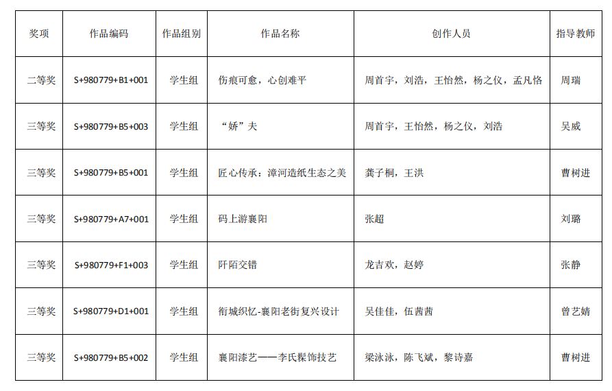 我校艺术系师生在此次比赛中共计7项作品获奖,其中周瑞老师指导作品获得二等奖,曾艺婧、曹树进、刘璐、张静、吴威老师指导作品获得三等奖。