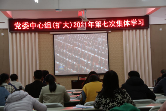 11月19日下午,学校在一教104报告厅召开党委中心组(扩大)2021年第七次集体学习会议,集体学习党的十九届六中全会精神。学校党政领导班子成员、全体中层干部、全体党支部书记参会。会议由党委委员、院长助理贾娴雅主持。