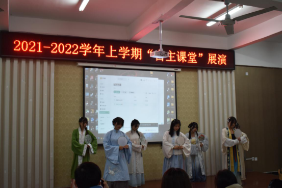 在各系“自主课堂”展示中,参与展演的7系代表队分别以小品、歌舞、朗诵的形式,展现了本学期自主课堂的成果。