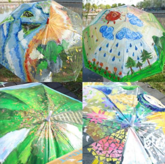 学生们将伞面画完后,在图书馆前广场参与评比。绘画内容多是海洋、天空、森林、山川,色调以绿色、蓝色为主,集中摆放在广场上,与青草地相映成趣。艺传系的专业教师和大众学生评委,对五十余个伞绘作品进行观赏并评出获奖作品。
