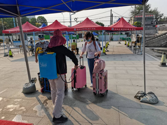工作人员为学生及其行李进行全面消杀