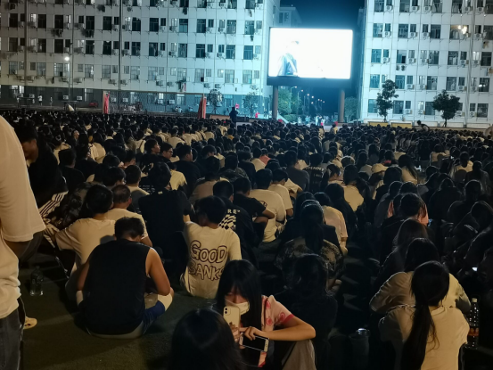晚上七点,操场大屏面向全校师生准时播放电影《长津湖》,各位新生在教官的组织下有序落座于指定场地。此部影片全景还原了抗美援朝战争中的第二次战役——长津湖之战,通过细致的表演和激烈的战斗,将各位观影的同学深深带入到那个战火纷飞的时期,革命先辈们舍生忘死、不惧强敌、英勇无畏的战斗精神,无不让在场的同学们动容。