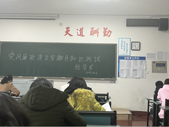 (经管系 周晓桥)为落实我校“党风廉政建设宣传教育月”有关工作安排,2022年10月6日下午,经管系在4教308教室开展党纪法规及廉政知识测试,该系全体教职工参加集中测试。