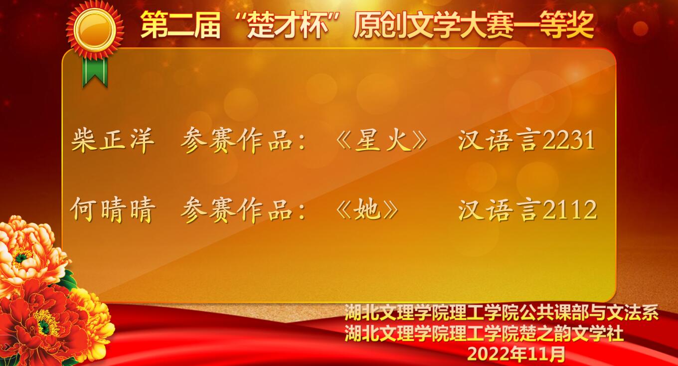 (公共课部与文法系 龚程 温娟)近日,由公共课部与文法系主办、楚之韵文学社承办的湖北文理学院理工学院第二届“楚才杯”原创文学大赛圆满收官。本届文学大赛由公共课部与文法系副主任刘慧、教学副主任王文琦策划指导,该系汉语言文学专业教师龚程负责大赛相关事宜。
