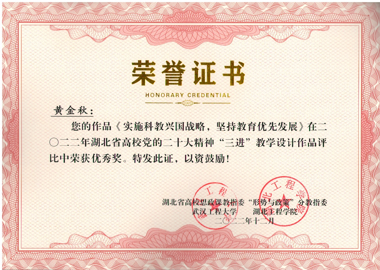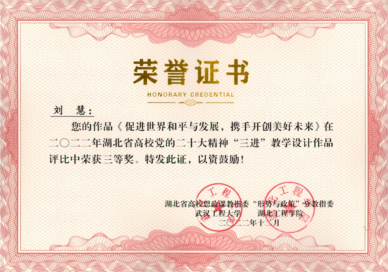 近日,在由湖北省高校思想政治理论课教学指导委员会“形势与政策”分教指委主办的关于党的二十大精神“三进”教学设计作品评比中,我校刘慧老师的作品《促进世界和平与发展,携手开创美好未来》荣获大赛“三等奖”,黄金秋老师的作品《实施科教兴国战略,坚持教育优先发展》、倪鑫杰老师的作品《开启全面建设社会主义现代化国家新征程》获得“优秀奖”。