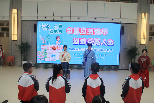 活动中,大学生蒋诗情等人通过演绎情景剧《匡衡凿壁偷光》和《宋应星买书》,表达了古人对知识的渴望和对书籍的珍爱,以此鼓励同学们以读书长知识,以读书增智慧,以读书促养成,以读书树理想,以读书育人格。