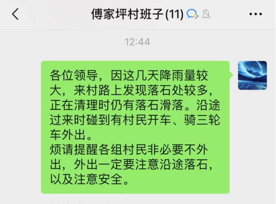 8月25日至27日,襄阳市范围内暴雨连绵,我校驻村工作队时刻惦记着傅家坪村的村民,担心村民受灾、农作物被毁、道路不通畅等情况。在确保自身安全的情况下,趁雨势稍小后从市区赶往村里。沿途中积极清理落石,保证道路通畅并充分利用工作群发布安全提醒。