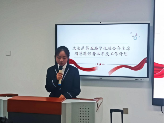 随后,新任学生会主席周慧莉向大家做出四点规划:协调各部门职能、提高业务能力、发挥模范作用、打造特色活动。