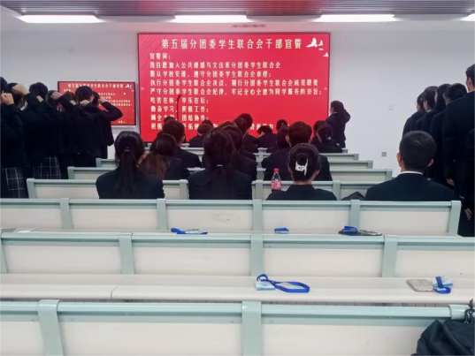 在该系分团委副书记许蓓蓓的带领下,新一届学生会全体干事紧握拳头,庄严宣誓。