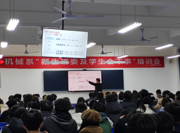 为加强学生干部队伍建设,提高学生干部思想素质和工作能力,11月11日晚,机械系在一教207教室召开新生班委及学生会干事培训会。