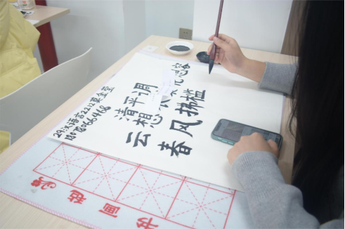 在毛笔比赛中,汉语言2212班莫金莹同学抽到了李白的《清平调·其一》,她表示:“我实在太幸运啦!这是我最喜欢的一首诗,刚刚书写的时候满是喜悦之情!”