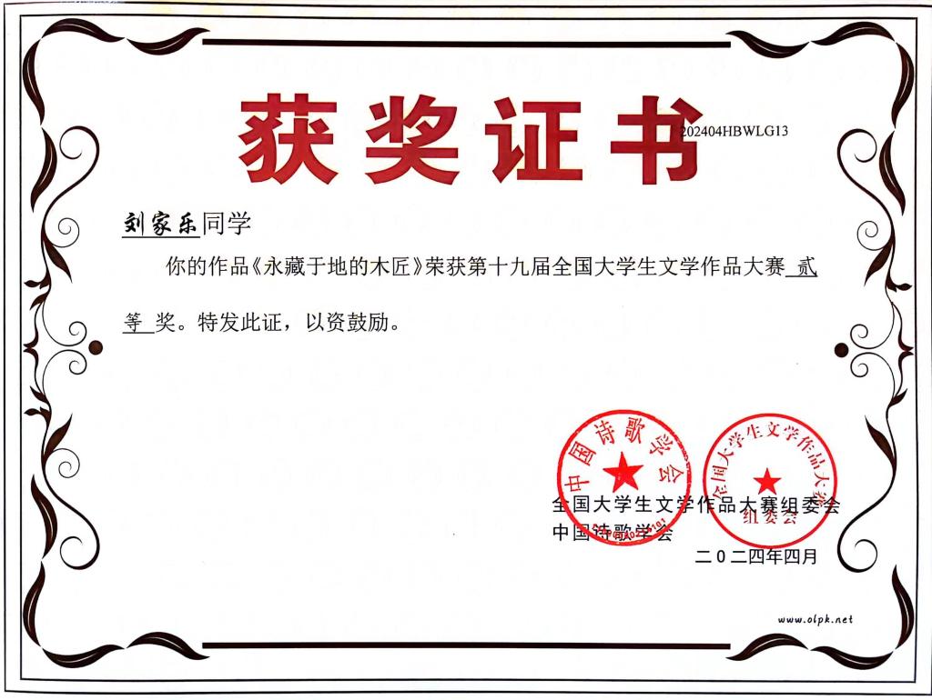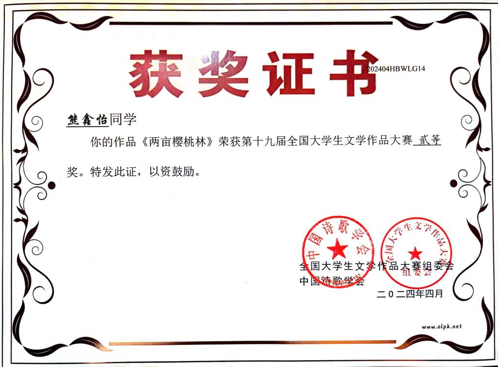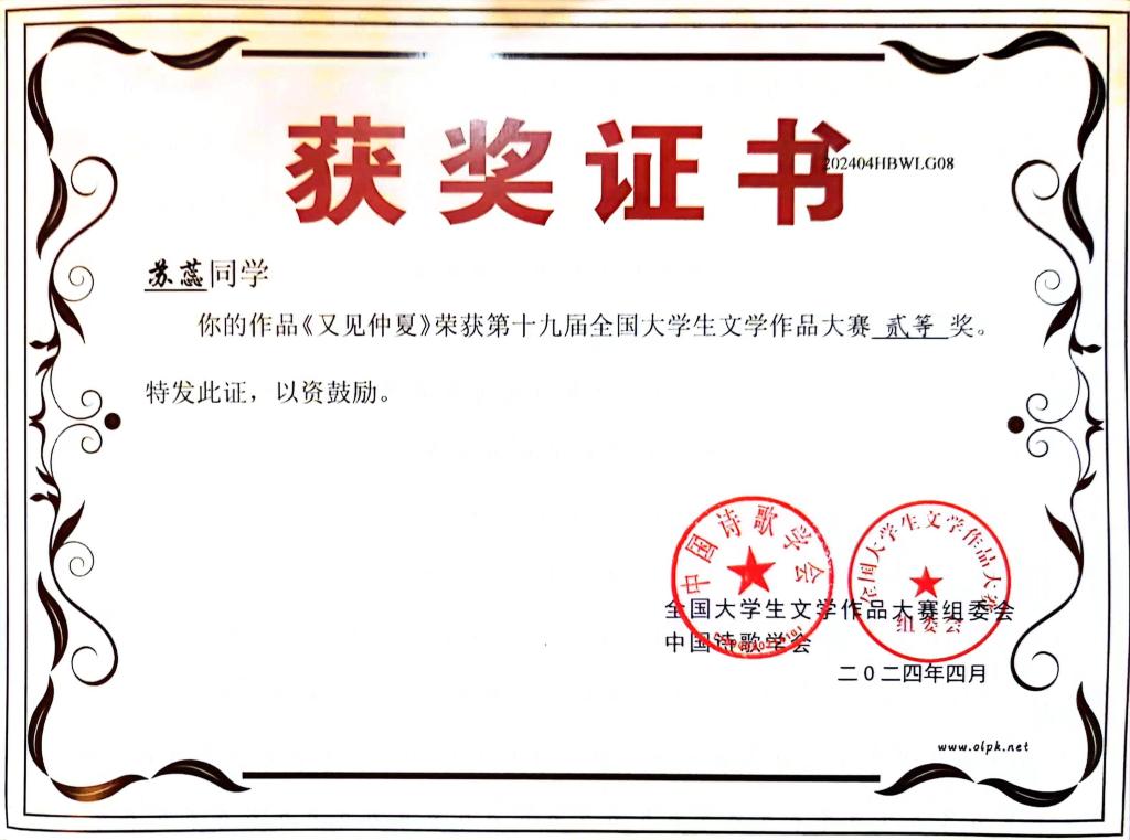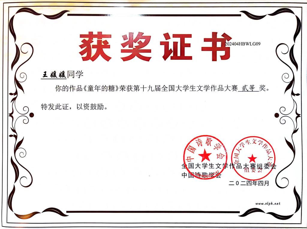 据悉,党的十九届全国大学生文学作品大赛是中国作协直属的中国诗歌学会指导、湖北省散文学会承办的一项面向全国高校的国家级文学赛事,旨在激发大学生的文学创作热情,发现文学新锐,繁荣校园文化。
