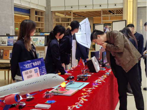 电控工坊区的声控音乐灯随旋律闪烁,遥控小车灵活穿梭,引发阵阵惊叹。
